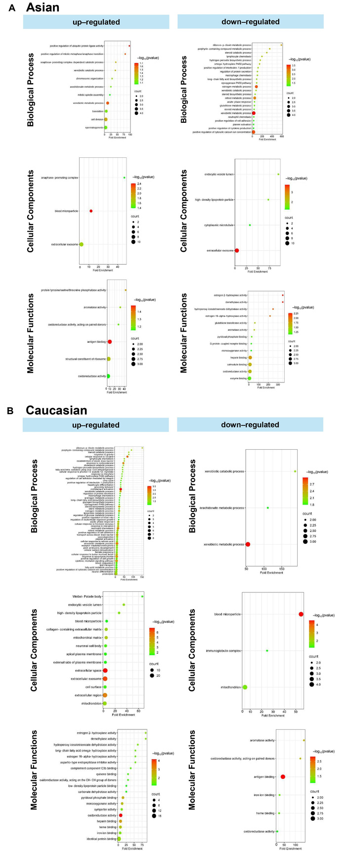 Gene ontology analysis comprises biological processes, cellular components, and molecular functions. (A) Unique upregulated and downregulated genes in the Asian population. (B) Unique upregulated and downregulated genes in the Caucasian population.