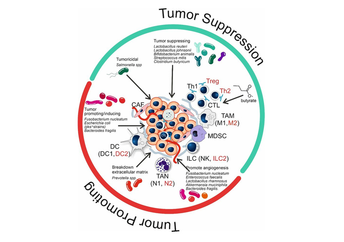 Effect of bacteria and bacterial metabolites on the status (tumor suppression; green semicircle, or tumor promoting; red semicircle) of the tumor microenvironment (TME). Cell types or differentiation states indicated in red have tumor promoting effects. Microbiota depicted in green have tumor suppressing effects; microbiota in red are tumor-promoting or -inducing (see text for further explanation). CAF: cancer-associated fibroblast; CTL: cytotoxic T cell; DC: dendritic cell; ILC: innate lymphoid cell; MDSC: myeloid-derived suppressor cells; NK: natural killer; TAM: tumor-associated macrophage; TAN: tumor-associated neutrophil; Treg: regulatory T cell.