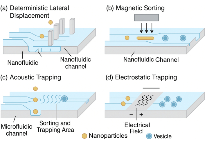 Schematic representation of nanofluidic cell-sorting strategies such as deterministic lateral displacement and magnetic sorting. These technologies illustrate complementary applications of nanofluidics in particle manipulation and separation.
