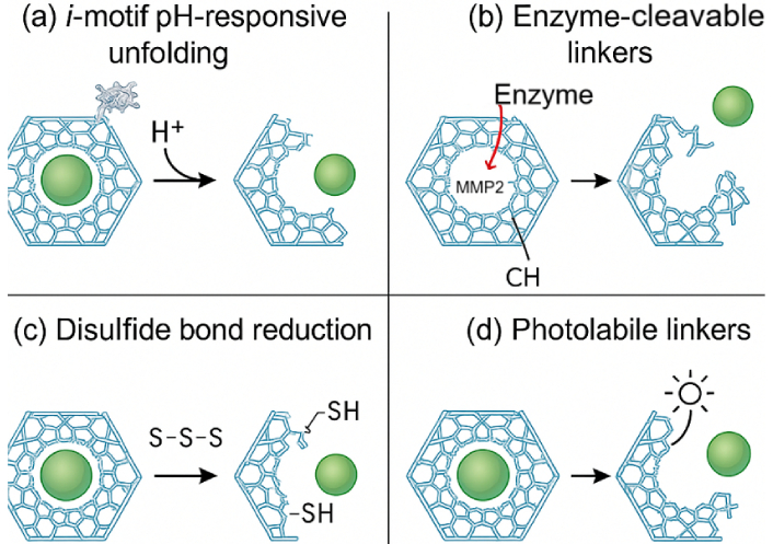 | Enzyme | MMP-2, MMP-9, Cas3 | Cleavage of peptide crosslinks to trigger nanocage opening | Enzyme-cleavable linkers integrated in hinge designs | Tumor stroma, apoptotic environments | 7× tumor growth suppression vs. control | [28] |