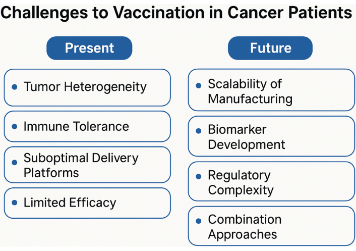 Vaccines may be most effective when combined with checkpoint blockade, targeted adjuvants (e.g., TLR agonists), or immunomodulators. Enhanced synergy has been observed in several tumor types, including melanoma (vaccine + pembrolizumab), prostate cancer (PROSTVAC + nivolumab), cervical cancer (PDS0101 + PDS01ADC + PD-L1/TGF-β inhibition, MEDI0457 + durvalumab, ISA101 + nivolumab), head and neck cancer (anti-MAGED4B/FJX1 + anti-PD-1) and supports further development of engineered combination strategies [18, 35–39]. Key present and future challenges to vaccination in cancer patients are illustrated in Figure 1.