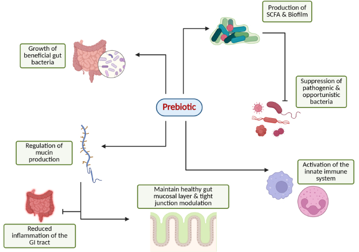 As illustrated in Figure 1, prebiotics achieve health benefits by exerting their effects through several key mechanisms, including the following: