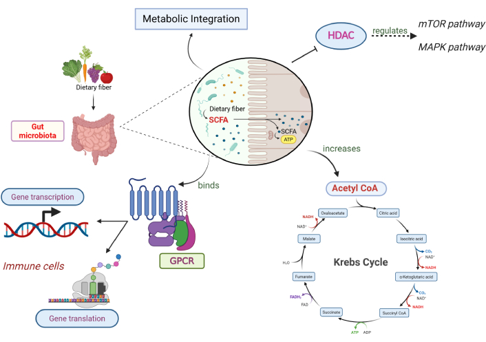 Downstream effects of SCFAs produced by gut microbiota. SCFAs regulate immune responses through multiple pathways. They inhibit histone deacetylases (HDACs), influencing mTOR/MAPK signalling and cytokine production, and act as ligands for G-protein-coupled receptors (GPCRs), altering intracellular calcium and cAMP to modulate immune cell gene expression. SCFAs also contribute to cellular metabolism by increasing acetyl-CoA availability. Depending on the context and cell type, SCFAs can exert anti-inflammatory or pro-inflammatory effects. Together, these mechanisms link microbial fermentation of dietary prebiotics with host immune regulation. SCFAs: short-chain fatty acids. Created in BioRender. Parvathy, S. (2025) https://BioRender.com/vlza4p9.
