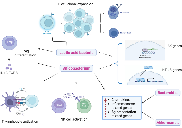 Prebiotics enhance gut microbiota that influences innate and adaptive immunity through various mechanisms, as can be demonstrated from Figure 3. The anti-inflammatory response is stimulated through pattern recognition receptors or GPCRs, promoting the increased production of inflammatory regulators, including dendritic cells, lymphocytes, monocytes, macrophages, and various innate immune factors, thereby enhancing immune surveillance and strengthening disease resistance [35]. Different genera of lactic acid bacteria (Lactobacillus casei, L. acidophilus, L. rhamnosus, L. delbrueckii subsp. bulgaricus, L. plantarum, L. lactis, and Streptococcus thermophilus) have immunomodulatory effects through various approaches. They have been shown to promote IL-6 release, which stimulates B cell clonal expansion leading to IgA release [36, 37]. Also, Bifidobacterium and Lactobacillus stimulate differentiation of T regulatory cells (Treg cells), inhibit the expression of JAK and NF-κB genes, increase the total helper T cells (CD4+) and activate T lymphocytes (CD25+) and natural killer (NK) cells [38, 39]. Li et al. [40] found that Bifidobacteria, Bacteroides, and Akkermansia muciniphila lead to an elevated expression of chemokines (CCL4 and CCL8), inflammasome-related genes (TLR3 and TLR7), and antigen presentation-related genes (CD40, Stat1, and ICOS). This indicates a mechanism by which the beneficial gut bacteria enhanced the recruitment and activation of immune cells in the tumor microenvironment, thereby imparting anti-tumor immunity. Furthermore, Akkermansia, Bifidobacterium, and Faecalibacterium are shown to be associated with programmed death 1 (PD-1) blockade in cancer patients, which is usually expressed by tumor cells to prevent the immune system response and suppress anti-tumor immunity [41–44].