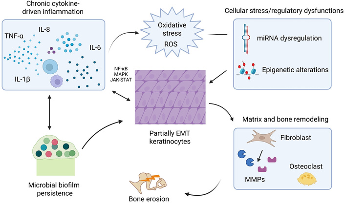 1) Axis-specific interventions such as local inhibition of RANKL or activin A to suppress osteoclastogenesis, MMP inhibitors to limit proteolytic bone erosion, antioxidant or redox-modulating agents to mitigate oxidative stress, epigenetic or RNA-modifying pathway modulators to regulate epithelial plasticity, and anti-biofilm strategies (e.g., DNases or quorum-sensing inhibitors) to disrupt persistent microbial inflammation.