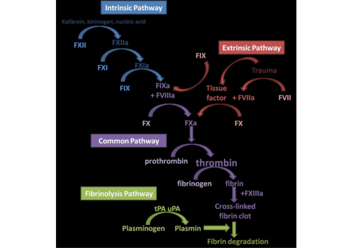 An overview of the coagulation cascade showing the various haemostatic pathways involved in haemostasis. FXII: factor XII; tPA: tissue-type plasminogen activator; uPA: urokinase-type plasminogen activator.