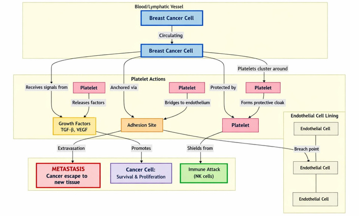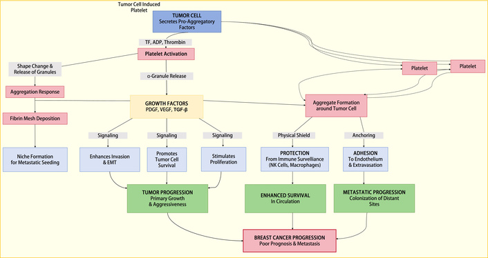 Platelets promote breast cancer progression and metastasis through various mechanisms, including the promotion of tumor angiogenesis and the facilitation of tumor extravasation via EMT [56]. They also increase the survival of tumor cells in circulation by aiding in immune evasion and phagocytosis avoidance [57] (Figure 2). Under physiological conditions, platelet activation by a stimulus leads to shape change and degranulation. The platelets’ α-granules and dense granules then release various substances that affect homeostasis. Tumor cells exploit this through a process called tumor cell-induced platelet aggregation (TCIPA) [58]. This can occur via tumor cell-induced thrombin generation or through the release of several mediators from activated platelets that induce platelet aggregation and other vascular changes promoting the growth, survival, motility, and extravasation of circulating cancer cells. These mediators include adenosine diphosphate and thromboxane A2, which have been shown to induce platelet aggregation in vitro [59, 60].
