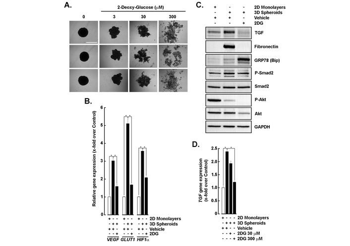 Glycolytic inhibition alters EMT and triggers stress signaling in 3D spheroids. (A) Representative images of 3D spheroids treated with increasing concentrations of 2-deoxy-D-glucose (2DG; 0–300 μM). Scale bar = 1,000 μm. (B) Relative angiogenic gene expression of VEGF, GLUT1, and HIF-1α in 2D monolayers (white bars) and 3D spheroids (black bars) following vehicle (H2O) or 2DG (300 μM) treatment. (C) Western blot analysis of EMT markers (TGF-β, fibronectin), ER stress marker (GRP78/Bip), and signaling proteins (phospho-Smad2, Smad2, phospho-Akt, Akt) in 2D monolayers and 3D spheroids treated with vehicle or 2DG (300 μM). GAPDH served as a loading control. (D) RT-qPCR analysis of TGF-β mRNA expression in 2D monolayers and 3D spheroids under vehicle or 2DG treatment (30 and 300 μM). All RT-qPCR data are expressed as fold change relative to control and performed in triplicate from two independent experiments. P < 0.05 (*) values are considered significant. EMT: epithelial-mesenchymal transition; TGF-β: transforming growth factor-β; ER: endoplasmic reticulum.