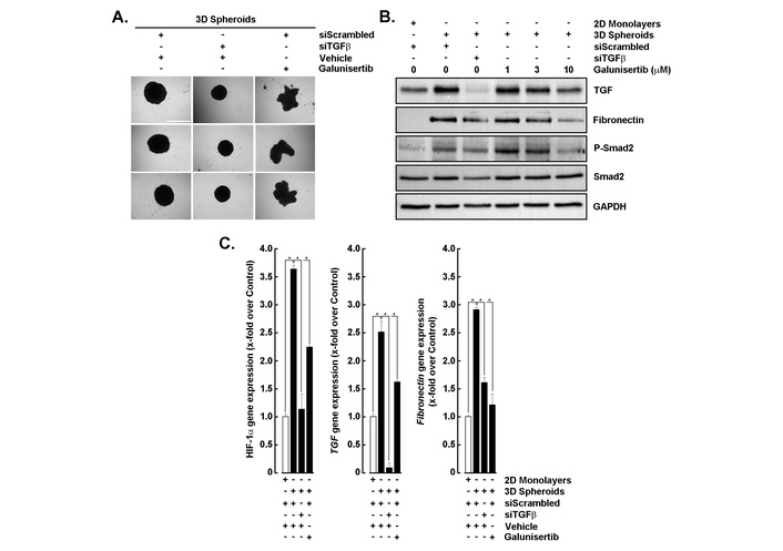 To determine the role of TGF-β/TGF-βR1 signaling in EMT within 3D spheroid cultures, cells were subjected to siRNA-mediated TGF-β knockdown (siTGFβ) or treated with galunisertib, a TGF-βR1 inhibitor [29, 30]. Morphological analysis showed that control spheroids (siScrambled) remained compact, whereas galunisertib treatment disrupted spheroid integrity and siTGFβ also reduced spheroid size (Figure 2A). Western blotting revealed elevated TGF-β and fibronectin expression in 3D spheroids compared to 2D monolayers, which were markedly reduced by siTGFβ and dose-dependent galunisertib treatment (Figure 2B). Both strategies targeting TGF-β downstream activity further led to a strong decrease in P-Smad2 levels, confirming effective inhibition of a potential TGF-β/TGF-βR1 signaling axis (Figure 2B). Consistent with these findings, RT-qPCR analysis demonstrated significant downregulation of TGF-β and fibronectin transcripts following siTGFβ and galunisertib exposure (Figure 2C, middle and right panels). Interestingly, spheroid-induced expression of HIF-1α was also altered (Figure 2C, left panel), as well as VEGF and GLUT1 in accordance with spheroid disruption (not shown). These results suggest that TGF-β signaling is critical for EMT induction and maintenance in 3D spheroids, and its inhibition attenuates EMT-associated markers and signaling activity.
