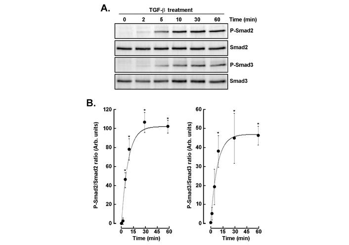 Time-dependent phosphorylation of Smad2 and Smad3 following TGF-β stimulation. (A) Western blot analysis of phospho-Smad2 (P-Smad2), total Smad2, phospho-Smad3 (P-Smad3), and total Smad3 in cells treated with TGF-β (30 ng/mL) for the indicated time. (B) Quantitative densitometric analysis of P-Smad2/Smad2 and P-Smad3/Smad3 ratios over time. Data are expressed as arbitrary units (mean ± SD) and are representative of three independent experiments. P < 0.05 (*) values are considered significant. TGF-β: transforming growth factor-β.