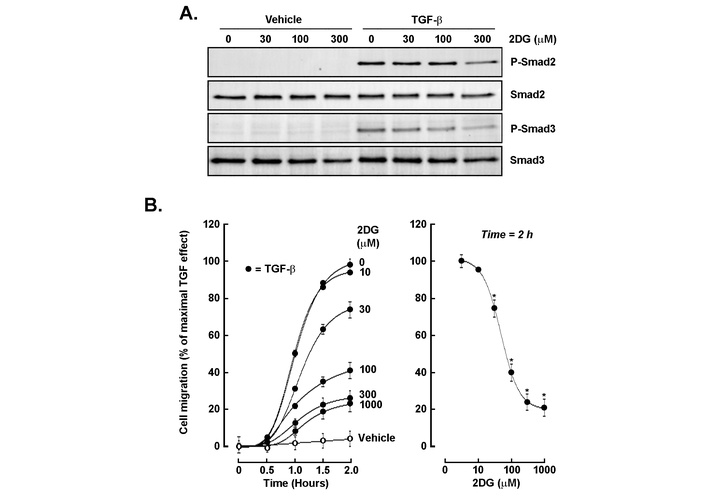 Glycolytic inhibition attenuates TGF-β-induced Smad phosphorylation and cell migration. (A) Western blot analysis of phospho-Smad2 (P-Smad2), total Smad2, phospho-Smad3 (P-Smad3), and total Smad3 in cells treated with vehicle or TGF-β (30 ng/mL) in the presence of increasing concentrations of 2-deoxy-D-glucose (2DG; 0–300 μM). (B) Quantitative cell migration assay showing TGF-β-induced migration over 2 h (closed circles) vs. unstimulated cells (open circles), and its dose-dependent inhibition by 2DG (left panel). The right panel summarizes migration at the 2-h time point, demonstrating near-complete suppression at ≥ 300 μM 2DG. Assay was performed in triplicate, and data are representative of two independent experiments. Data are expressed as a percentage of the TGF-β-stimulated control (mean ± SD). P < 0.05 (*) values are considered significant. TGF-β: transforming growth factor-β.