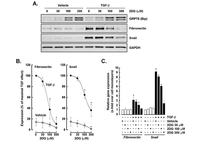 Glycolytic inhibition suppresses TGF-β-induced EMT marker expression and induces ER stress. (A) Western blot analysis of GRP78 (BiP), fibronectin, and Snail expression levels in cells treated with vehicle or TGF-β (30 ng/mL) in the presence of increasing concentrations of 2-deoxy-D-glucose (2DG; 0–300 μM). GAPDH served as a loading control. (B) Quantitative analysis of fibronectin and Snail protein levels expressed as a percentage of TGF-β-stimulated control. Densitometry analysis was performed in three independent experiments. (C) RT-qPCR analysis of fibronectin and Snail mRNA expression under the same indicated conditions. All RT-qPCR data are expressed as fold change relative to control and performed in triplicate from two independent experiments. P < 0.05 (*) values are considered significant. TGF-β: transforming growth factor-β; EMT: epithelial-mesenchymal transition; ER: endoplasmic reticulum.
