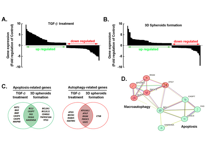 Comprehensive analysis of gene expression changes and functional interactions under TGF-β treatment and 3D spheroid formation. Waterfall plots showing differential cell death-related gene expression profiles after TGF-β treatment (A) and 3D spheroid formation (B) compared to the 2D monolayer control. Genes were ranked by fold-change (log2 scale), with upregulated genes (log2 FC ≥ 2, P < 0.05) highlighted in green and downregulated genes (log2 FC ≤ –2, P < 0.05) in red. (C) Venn diagrams illustrating the overlap of apoptosis-related genes (left) and autophagy-related genes (right) between TGF-β treatment and 3D spheroid conditions. (D) Protein–protein interaction network generated using the STRING database (confidence score ≥ 0.7) for selected genes involved in macroautophagy and apoptosis. Nodes represent proteins, edges indicate functional associations, and color intensity reflects interaction confidence. Clustering reveals strong connectivity between autophagy regulators and apoptosis mediators, suggesting pathway crosstalk. TGF-β: transforming growth factor-β.