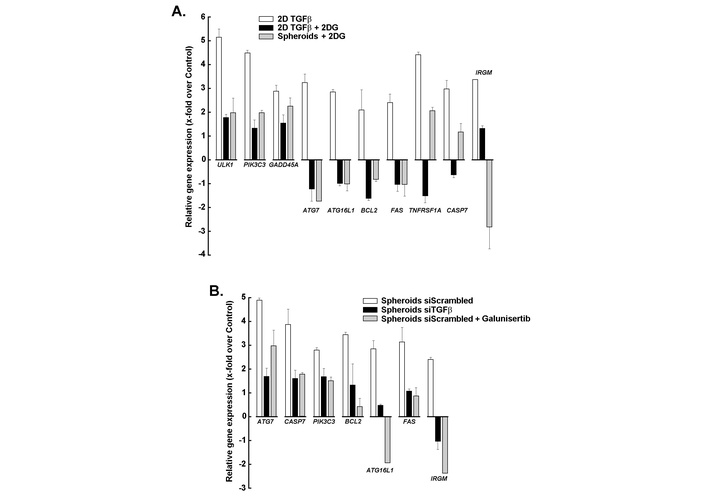 Impact of metabolic and signaling modulation on apoptosis- and autophagy-related gene expression in 2D and 3D cultures. (A) Relative expression of apoptosis- and autophagy-related genes in 2D cultures treated with TGF-β (white bars), 2D cultures treated with TGF-β + 2DG (black bars), and 3D spheroids treated with 2DG (grey bars), compared to untreated control. (B) Relative gene expression changes in 3D spheroids under different conditions: scrambled siRNA (white bars), siTGFβ (black bars), and galunisertib treatment (grey bars). Bars represent mean fold-change relative to control, whereas negative values indicate downregulation. Experiments are the means of two experiments, each performed in triplicate. TGF-β: transforming growth factor-β; 2DG: 2-deoxy-D-glucose.