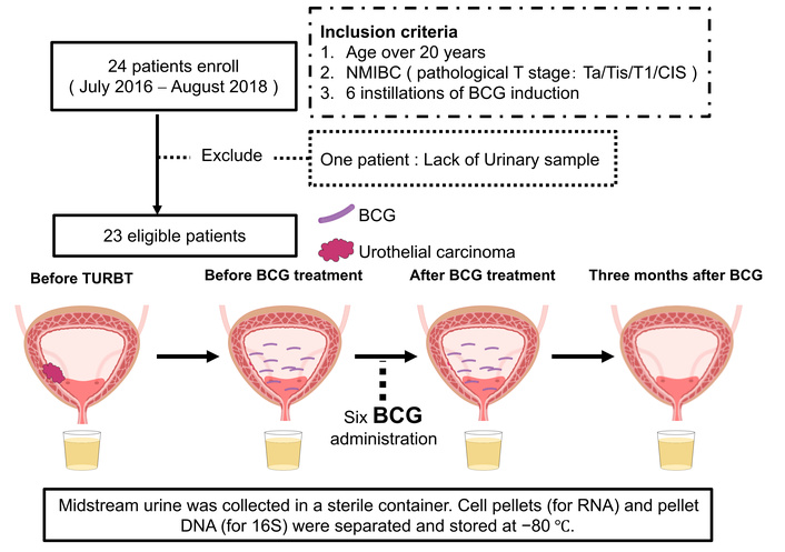 Accordingly, we aimed to collect urine from patients with NMIBC at four time points: before TURBT, before BCG induction, immediately after completion of BCG induction, and 3 months thereafter, to concurrently analyze temporal dynamics of urinary immune markers and the urinary microbiome. We hypothesized that intravesical BCG elicits transient yet coordinated changes in the urinary immune environment and microbial community, and that these features are associated with clinical outcomes such as recurrence and progression.