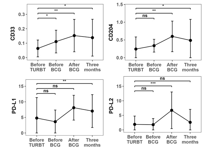 Analysis of immune-related gene expression in urine sediment offers a noninvasive window into the bladder’s intravesical immune environment. PD-L1, PD-L2, CD204, and CD33 expression are associated with BCG responsiveness and recurrence [15]. However, no study has evaluated these immune indices and microbiome compositions in a longitudinal and integrated manner. This approach can reveal dynamic immunity-microbiome coupling, informing mechanisms of treatment response and enabling predictive marker development.