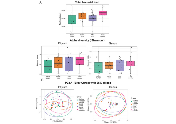 Alpha diversity assessed by the Shannon index did not differ among time points (Kruskal–Wallis, P = 0.39). Total 16S read counts can be influenced by sequencing depth, library preparation, and amplification efficiency; therefore, read count differences should not be interpreted as changes in absolute bacterial load without independent absolute-quantification methods. Total 16S read counts differed across time points (P = 0.0023) and were higher at three months after BCG than before TURBT (q = 0.011; Figure 3A). Beta diversity based on Bray–Curtis distances suggested no clear separation between groups (PERMANOVA pseudo-F = 1.71, R2 = 0.068, P = 0.245), and within-group dispersion did not differ (P = 0.641; Figure 3B). These findings suggest that the qualitative composition of the urinary community was broadly stable across the four time points. Because total read counts can be influenced by sequencing depth and amplification efficiency, we interpret read count differences as technical or biological variation in sequencing output rather than evidence of changes in absolute bacterial load.