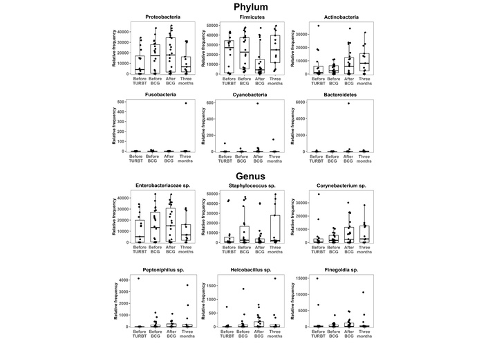 Dominant phyla included Proteobacteria, Firmicutes, Bacteroidetes, and Actinobacteria. Only Bacteroidetes suggested a significant overall effect on relative abundance (χ2 = 11.0, degrees of freedom = 3, P = 0.013) when temporal changes were evaluated using the Friedman test. However, Benjamini–Hochberg-adjusted pairwise comparisons were not significant (minimum q = 0.29, for after BCG vs. 3 months and before TURBT vs. 3 months). The remaining phyla (Actinobacteria, Firmicutes, and Proteobacteria) suggested no significant time-dependent differences (all P > 0.1).