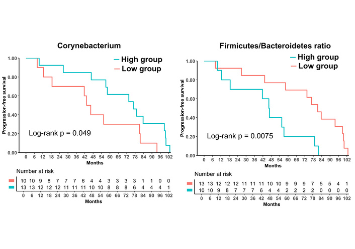 Prognosis analysis: after and three months after BCG treatments. Progression-free survival (PFS) curves stratified by quantile-based high versus low groups for post-BCG F/B ratio (Post_Bal_FB), and Corynebacterium log-abundance (Post_Cory_nb). Patients with a higher post-BCG F/B ratio experienced poorer PFS, whereas those with higher post-BCG Corynebacterium abundance suggested more favorable PFS. P values were obtained from log-rank tests. BCG: Bacillus Calmette–Guérin; F/B: Firmicutes/Bacteroidetes.