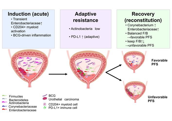 Proposed working model linking BCG-associated inflammation, urinary microbiome dynamics, and progression risk. This schematic depicts a hypothesis-generating three-phase framework. During the induction phase, intravesical BCG may coincide with changes in urinary immune activity and shifts in selected urinary taxa or balances. An adaptive resistance phase may follow, characterized by higher PD-L1 expression and compositional patterns that could reflect differences in host inflammatory tone. During the reconstitution phase, the re-emergence of specific community features (e.g., Corynebacterium- and Enterobacteriaceae-associated indices) together with a balanced F/B ratio was associated with favorable PFS in this cohort, whereas other post-BCG patterns were associated with earlier progression. This working model does not imply causality and requires validation in independent cohorts and mechanistic studies. BCG: Bacillus Calmette–Guérin; F/B: Firmicutes/Bacteroidetes; PFS: progression-free survival.