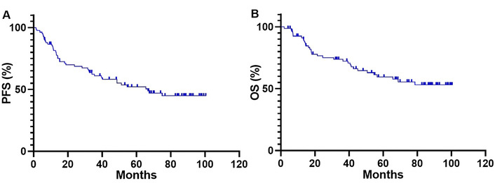 Kaplan-Meier curves for PFS (A) and OS (B) of patients who received lorlatinib therapy. PFS: progression-free survival; OS: overall survival.