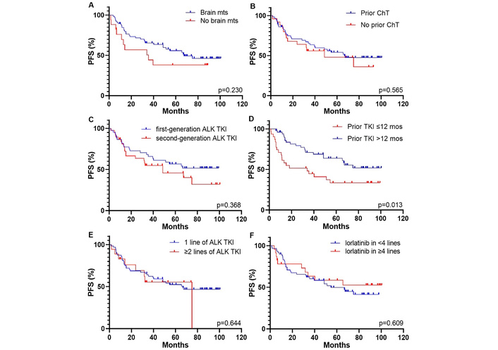 Kaplan-Meier curves for PFS of patients who received lorlatinib therapy based on different parameters. (A) brain mts; (B) prior chemotherapy; (C) generation of previous ALK TKI; (D) response to prior ALK TKI; (E) number of prior lines of ALK TKIs; (F) line of lorlatinib therapy. ALK: anaplastic lymphoma kinase; ChT: chemotherapy; mos: months; mts: metastases; PFS: progression-free survival; TKI: tyrosine kinase inhibitor.