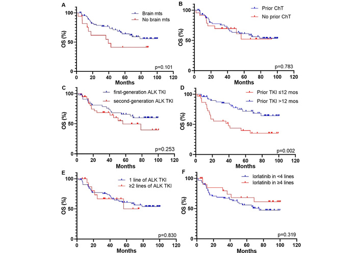 Kaplan-Meier curves for OS of patients received lorlatinib therapy based on different parameters. (A) brain mts; (B) prior chemotherapy; (C) generation of previous ALK TKI; (D) response to prior ALK TKI; (E) number of prior lines of ALK TKIs; (F) line of lorlatinib therapy. ALK: anaplastic lymphoma kinase; ChT: chemotherapy; mos: months; mts: metastases; OS: overall survival; TKI: tyrosine kinase inhibitor.