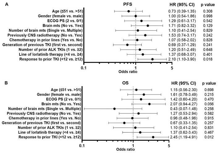 The forest plots summarize the univariate analysis of clinical parameters for predicting progression-free survival (A) and overall survival (B). ALK: anaplastic lymphoma kinase; CNS: central nervous system; ECOG PS: Eastern Cooperative Oncology Group Performance Status; mts: metastases; TKI: tyrosine kinase inhibitor.