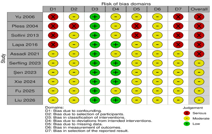 Risk of bias in each clinical study included in the systematic review was assessed using the Risk Of Bias In Non-randomized Studies—of Interventions (ROBINS-I) tool [22]. ROBINS-I evaluates the potential bias across seven domains: (1) bias due to confounding, (2) bias in selection of participants, (3) bias in classification of interventions, (4) bias due to deviations from intended interventions, (5) bias due to missing data, (6) bias in measurement of outcomes and (7) bias in selection of the reported result. Each domain was assessed individually with judgments categorized as low, moderate, serious, critical risk of bias, or no information, depending on the study design. Risk-of-bias assessment was performed independently by two researchers, and any disagreements were resolved through discussion with a third researcher.