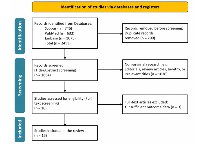 The initial search identified 2,453 published articles, from which 799 duplicates were removed, leaving 1,654 records for screening. Following the title and abstract evaluation, 1,636 studies were excluded as they did not meet the predefined inclusion criteria. During full-text assessment, an additional 3 articles were excluded due to insufficient data. Ultimately, 15 studies were included in the review, comprising 7 prospective clinical trials/prospective cohorts [23–29], 3 retrospective cohorts [30–32], 4 case reports [33–36], and 1 case series [37]. (Figure 2).