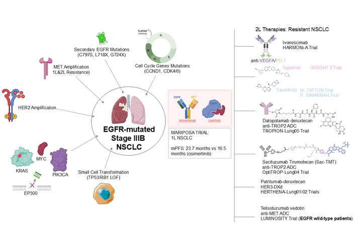 Mechanisms of resistance in EGFR-mutated NSCLC and therapeutic strategies. The central image depicts an EGFR-mutated NSCLC cell (stage IIIB), surrounded by various mechanisms of acquired resistance, including secondary EGFR mutations (C797S, L718X, G724X), MET amplification (1L & 2L resistance), HER2 amplification, cell cycle gene mutations (CCND1, CDK4/6), KRAS and PIK3CA mutations, EP300 deletions, and small cell transformation (TP53/RB1 LOF). The MARIPOSA trial, combining amivantamab and lazertinib for 1L NSCLC, is highlighted with key efficacy data [mPFS: 23.7 months vs. 16.5 months (osimertinib)]. On the right, 2L+ therapeutic strategies for resistant NSCLC are listed, featuring agents like ivonescimab (anti-VEGFA/PD-1) in the HARMONi-A trial, tepotinib (INSIGHT 2 trial), savolitinib (Ib: TATTON trial; II: SAVANNAH trial), datopotamab deruxtecan (anti-TROP2 ADC) in TROPION-Lung05 trial, sacituzumab tirumotecan (Sac-TMT, anti-TROP2 ADC) in OptiTROP-Lung04 trial, patritumab deruxtecan (HER3-DXd) in HERTHENA-Lung01/02 trials, and telisotuzumab vedotin (anti-MET ADC) in the LUMINOSITY trial (for EGFR wild-type patients). The graphical scheme was produced by the authors. Some elements in this figure were drawn using pictures from Servier Medical Art by Servier, which is licensed under a Creative Commons Attribution 3.0 Unported License (https://creativecommons.org/licenses/by/3.0/).