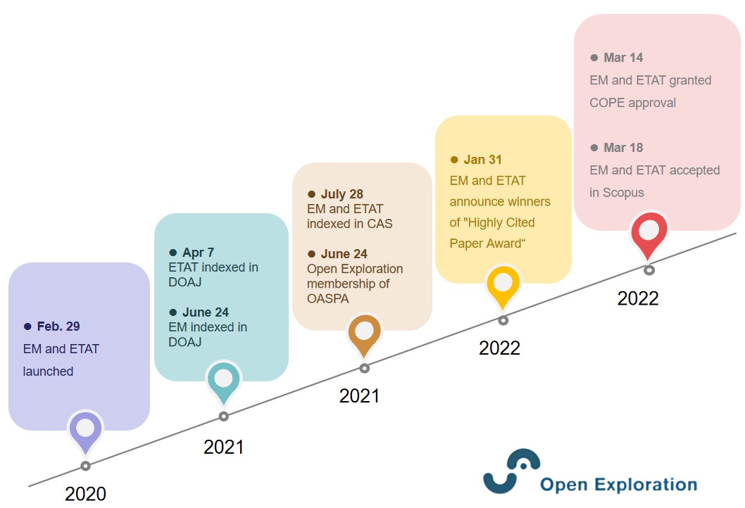 Since their launch in February 2020, both EM and ETAT have quickly become respected and influential journals by adhering to the highest standards of academic publishing, as shown in the progress map below. This is due to the commitment of the journals’ hand-picked Editors-in-Chief and editorial board members, as well as the journals’ authors and supporting staffs at Open Exploration.